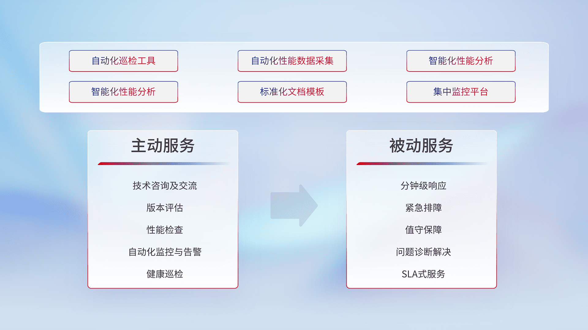 智能化工具和标准化文档,,,保障服务质量,,,提供主动服务(包含技术咨询、、、、版本评估、、、性能检查、、、、自动化监控与告警、、、、健康巡检)和被动服务包含(分钟级响应、、紧急排障、、值守保障、、问题诊断解决、、、SLA服务)。。。